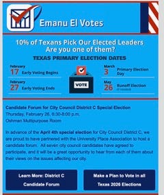 Happily, we are not alone! This primary election is shaping up to have uncharacteristically high voter turnout across the state. Historically, Texas has a dismal voter turnout rate in primaries—around 14% of the total voting population in the 2024 primaries. However, this year in the first two days of early voting, county data shows 22,314 people casted votes. That is a 196% increase from 2022 and a 116% increase from 2024. Perhaps the most encouraging element is that, according to Ryan Data and Research, 34% of these voters have never voted before in a primary.