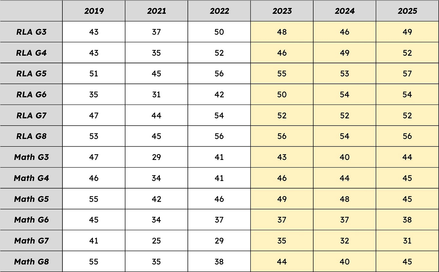The data in the chart shows last year’s test results, but if you count back at what age most of these kids would have received foundational mathematics knowledge (i.e. kindergarten - 2nd grade), they missed huge chunks of the curriculum. Math has to be taught in a certain order to ensure foundational skills are in place prior to building new knowledge. Without that solid start, it is no wonder our kids are having trouble getting ahead. My theory why we didn’t do as poorly on reading is because parents were much more likely to ask their kids to read a book than do a page of math facts while they were home during the pandemic.